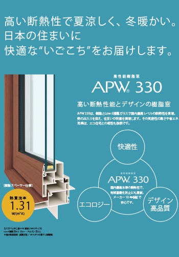 構成の樹脂窓「APW300」は、高い断熱性で夏涼しく、冬暖かい。日本の住まいに快適な“いごこち”をお届けします。、樹脂とLow-E複層ガラスで国内最高レベルの断熱性を実現。熱の出入りを抑え、住まいの快適を実現します。その気密性の高さや省エネ効果は、エコ住宅との相性も抜群です。