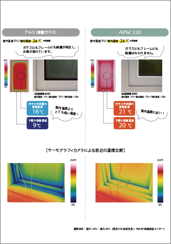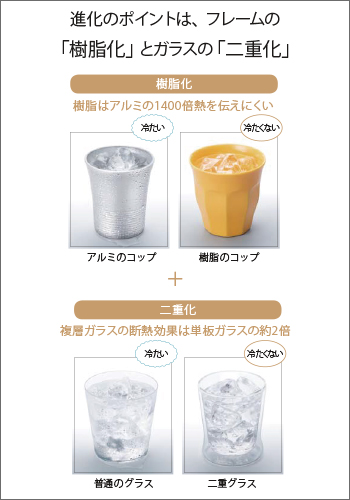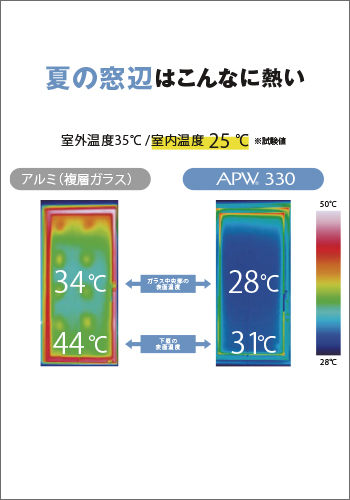 「断熱」とは、熱が伝わらないようにすること。住まいの断熱がスムーズに行われると、外気温の影響が小さくなります。すると、暑い日も寒い日も、家の中は快適な温度を実現することができるのです。APW 330の樹脂窓は、フレームをアルミから樹脂にし、ガラスを複層にすることで、その断熱性を高めています。