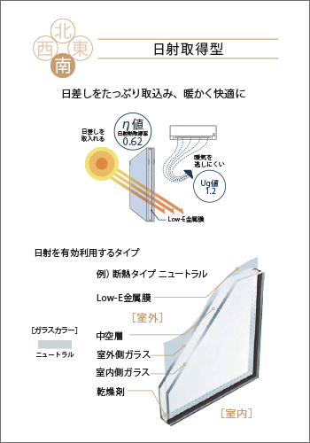 太陽の熱といかに上手に付き合うか? を考えて、目的に合せた2タイプのLow-E複層ガラスをラインアップ。日射取得を優先する場所や方角には、断熱タイプ ニュートラルがおすすめ。視界もクリアで太陽光を取込み、冬の暖房熱を外へ逃しません。