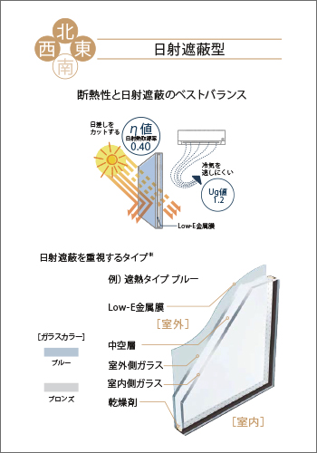 太陽の熱といかに上手に付き合うか? を考えて、目的に合せた2タイプのLow-E複層ガラスをラインアップ。断熱性能と日射遮蔽のベストバランスを実現したのが、遮熱タイプブルーです。西日を遮り、冬の熱の出入りや結露を抑えます。