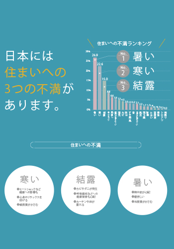 日本には住まいへの「寒い」「結露」「暑い」の3つの不満があります。「APW300」はこの3つの不満を解消するお手伝いをします。