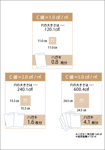 住まいの気密性を見るのにC値というものがあります。建物全体の延床面積(㎡)で建物全体のすき間面積(㎠)の合計を割った数値です。C値が低いほど建物の気密性が高いことになります。換気口などさまざまな住まいのすき間を合計し、例えばC値=5.0㎠/㎡の家の場合、なんと住まいにハガキ4.1枚分の穴が空いているのと同じことになるのです。