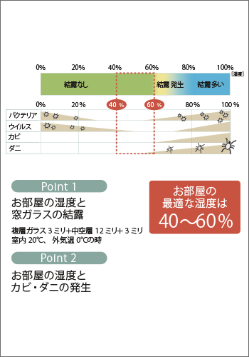結露を引き起こす原因は「温度」と「湿度」。この2つを見直すことで、結露は発生しにくくなります。また、湿度をコントロールすることで、ダニやカビの抑制にもつながるのです。