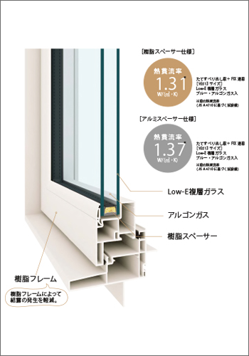 樹脂+Low-E複層ガラスがアルゴンガス封入で、樹脂スペーサー仕様では国内最高レベルの熱貫流率1.31 W/(㎡・K)をを実現。熱貫流率の値が低いほど、熱の移動が少なく抑えられます。