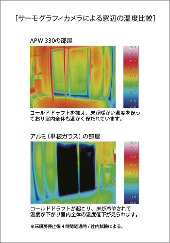 コールドドラフトとは、窓辺で冷やされた空気が、下降気流となり足元に流れ溜まっていく現象。空気には、暖かい空気は上へ、冷たい空気は下へ溜まる性質があります。「APW300」の部屋ではコールドドラフトを抑え、床が暖かい温度を保っており室内全体も温かく保たれています。