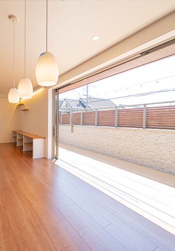 リビングと一続きになったバルコニーは、内と外が曖昧に繋がる開放的な空間を創出します。大きな窓を開放すれば、リビングは自然と一体となり、心地よい風が通り抜ける快適な場所へ。季節の移ろいを感じながら家族とくつろげる心安らぐアウトドアリビングとして、日々の暮らしに豊かな繋がりをもたらします。