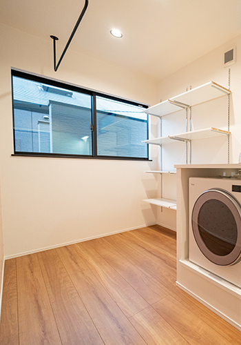 陽光が降り注ぐランドリールームは、家事の効率を高めながら、心まで明るくする場所です。「乾太くん」を導入することで、乾燥時間を大幅に短縮し、部屋干しのストレスから解放されます。清潔感あふれる空間で、洗濯物がスムーズに片付く喜びを実感。日々の家事を心地よく、そしてスマートにこなせるよう設計しました。