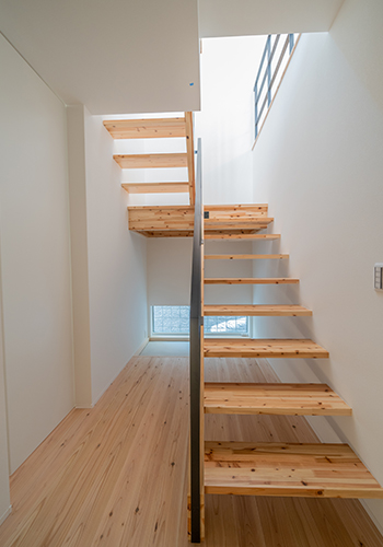 玄関の正面に配されたストリップ階段は、光が降り注ぐ、明るく開放的なエントランスを創り出します。段板の隙間から差し込む自然光は、空間に奥行きと変化を与え、視覚的な広がりを生み出します。上下階の繋がりを自然に感じさせることで、家族の気配が緩やかに伝わる、心地よい一体感のある住まいを実現します。