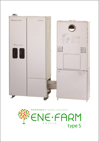 世界最高の発電効率(発電効率55%)を備えた「エネファームtypeS」。クリーンな都市ガスから水素を取り出し、空気中の酸素と化学反応させることで発電。発生する熱で給湯もでき効率的です。