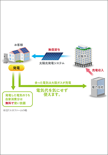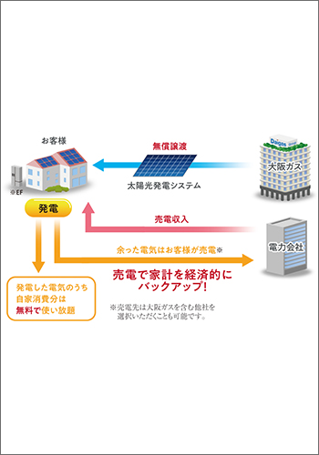 太陽光発電システムを無償で貸与。10年間は発電した電力のうち、自家消費分を無料でご利用いただけます。※余った電気の売電収入は大阪ガスが収受します。