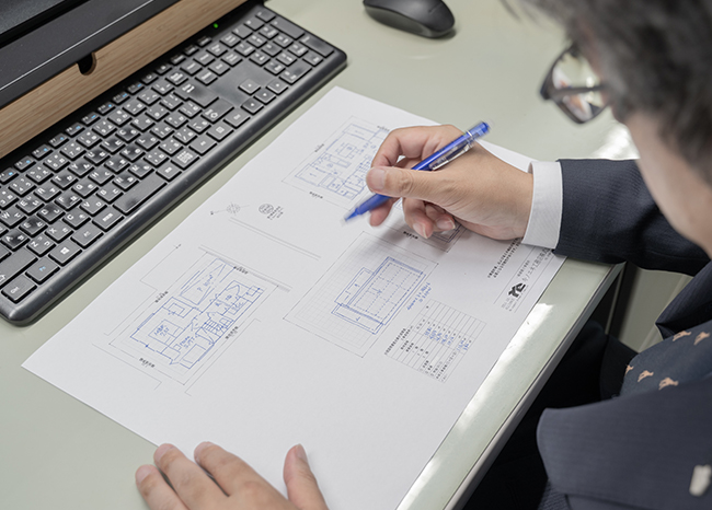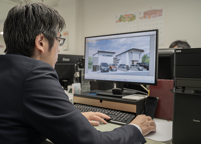 コンセプトに基づき、製図やデザインを作成し、営業、施工管理と評議を行います。そこで出た意見をもとに修正を加えます。この作業を繰り返し行いデザインを完成させます。